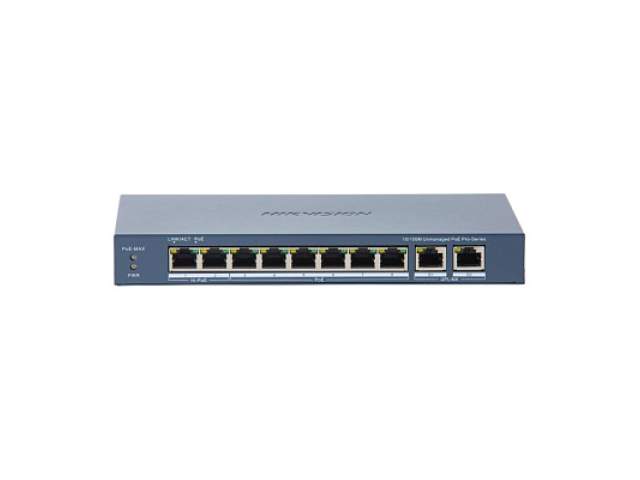 - 8 портов 10/100 Мбит/с с поддержкой PoE для подключения устройств и 2 гигабитных Uplink-порта (10/100/1000 Мбит/с) для связи с видеорегистратором или ядром сети.